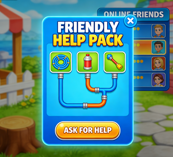 This is a social interaction package designed for players of the game “Pipe Connection/Water Pipe Connection” who are social butterflies, helpful, and enjoy playing with friends. The happiest moments in the game are often those spent with friends. This package enriches and enhances your interactions with friends: it includes 10 “Help Signal” items, allowing you to send help to online friends when stuck, and receive remote “guidance” (drawing lines on the screen to provide hints); it also includes 5 “Friendship Sponsorship” items, which can directly gift friends a small amount of stamina or coins to increase intimacy; and a set of limited-edition “Best Buddies” chat emoticons to make your chats more lively. Whether it’s asking for help, offering assistance, or simply interacting daily, this package will deepen your friendship.